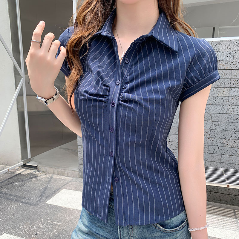 실제 가격#줄무늬 전면 어깨 어깨 짧은 슬림 셔츠 2025 여름 디자인 주름 허리 슬림하고 슬림