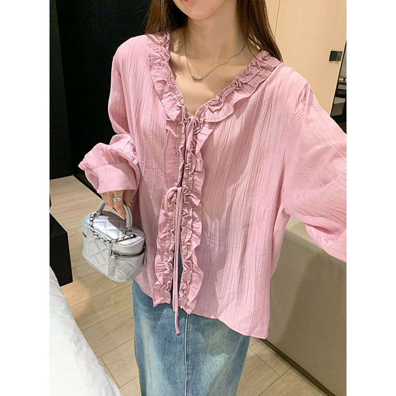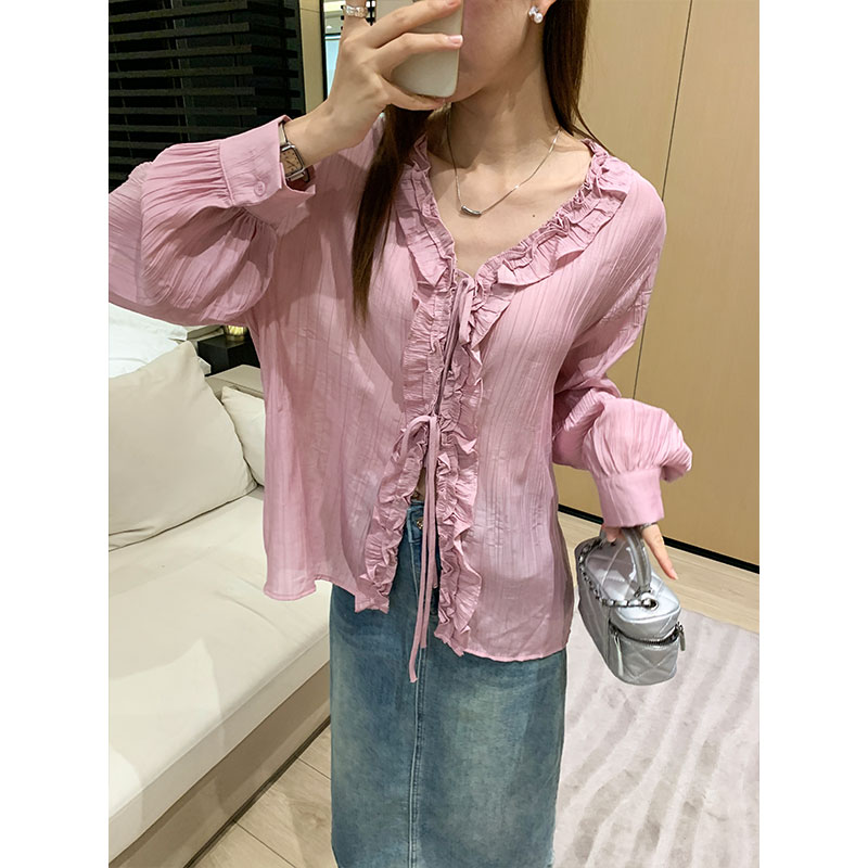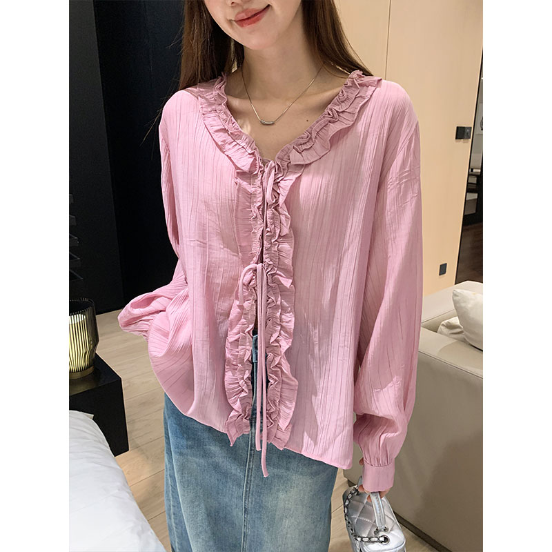 실제 가격 V-Neck Raspberry Vermicelli 줄무늬 나무 이어링 묶인 여성용 셔츠 재킷 2025 여름 셔츠 긴 소매 다목적