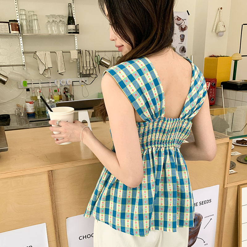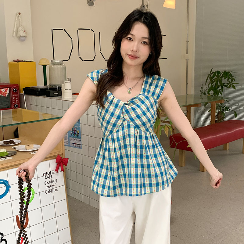 실제 가격#여자를위한 격자 무늬 플로럴 서스펜더 조끼 2025 새로운 달콤하고 매운 나이 감소 외부 민소매 셔츠 탑