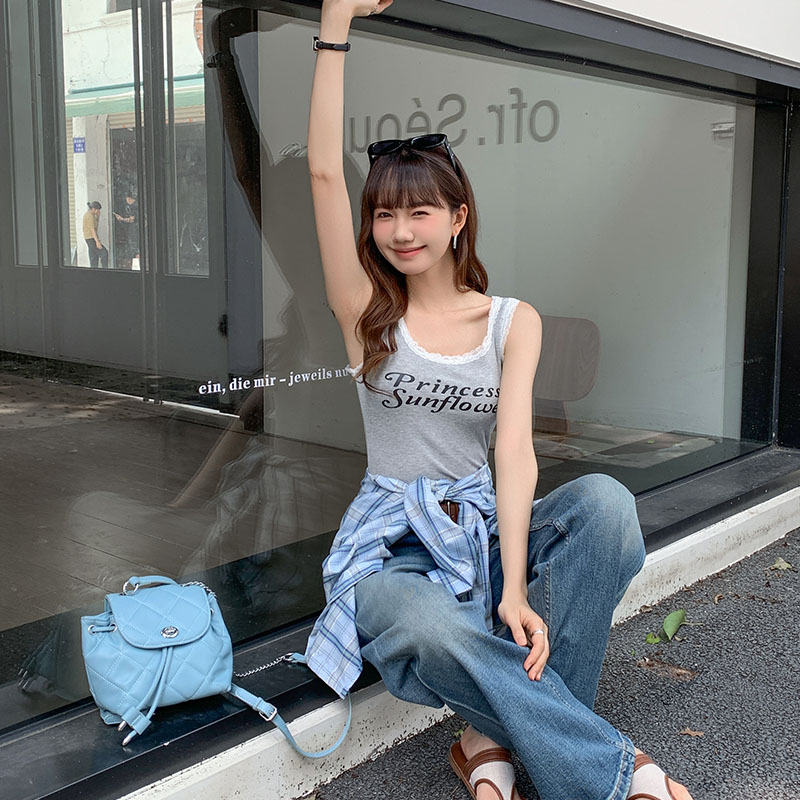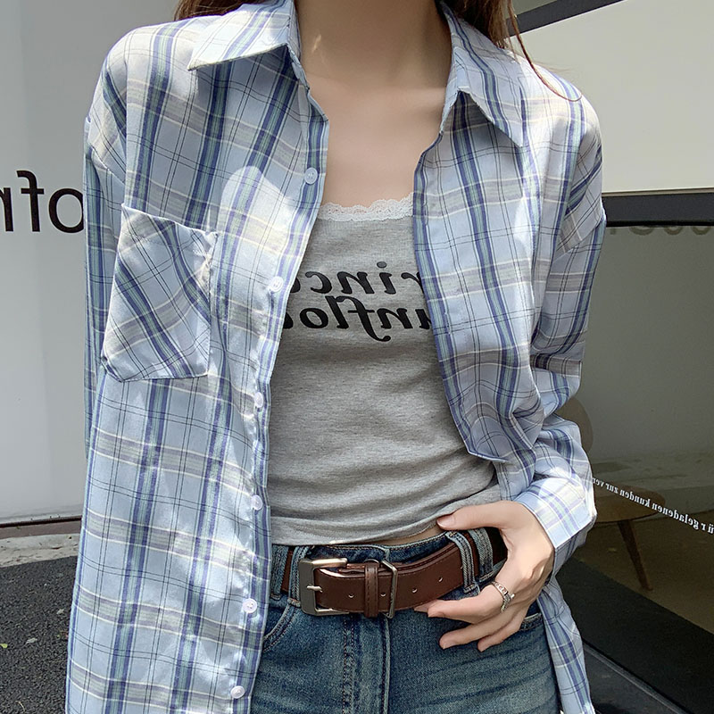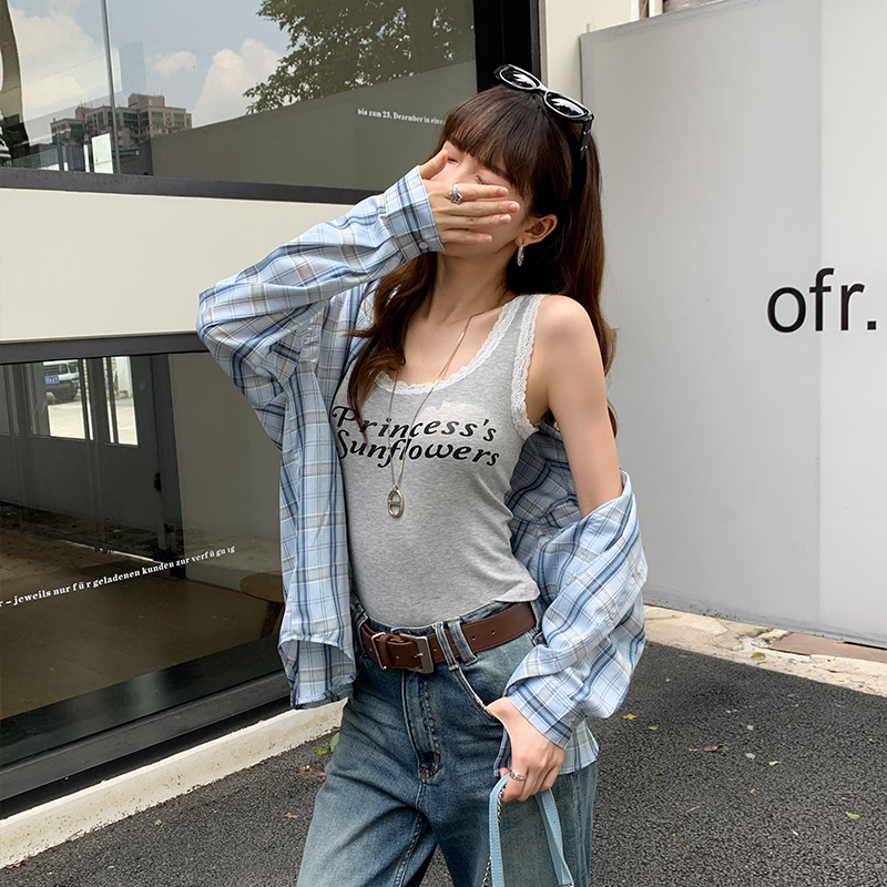 실제 가격 폴로 칼라 블루 격자 무늬 서스펜더 조끼 여성용 2 피스 선 스크린 셔츠 2025 새로운 다목적