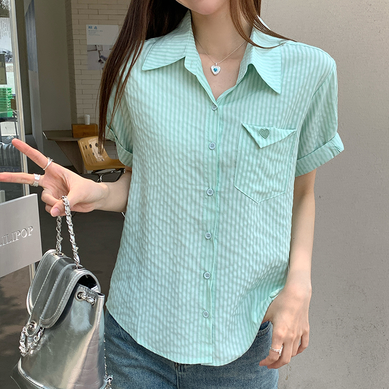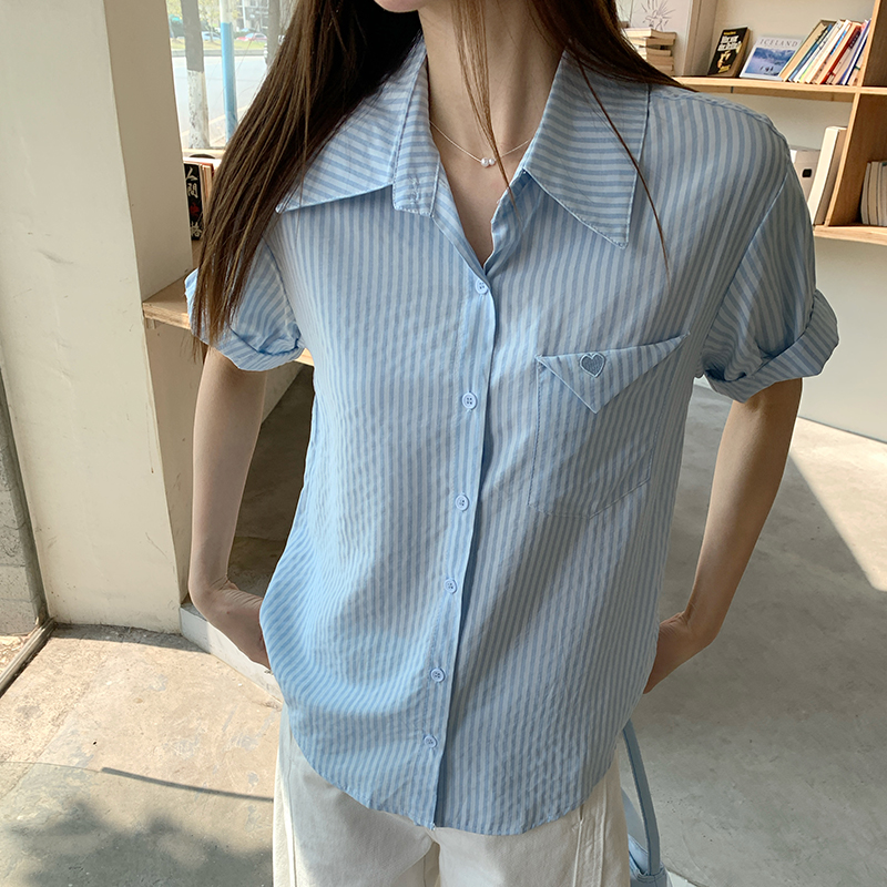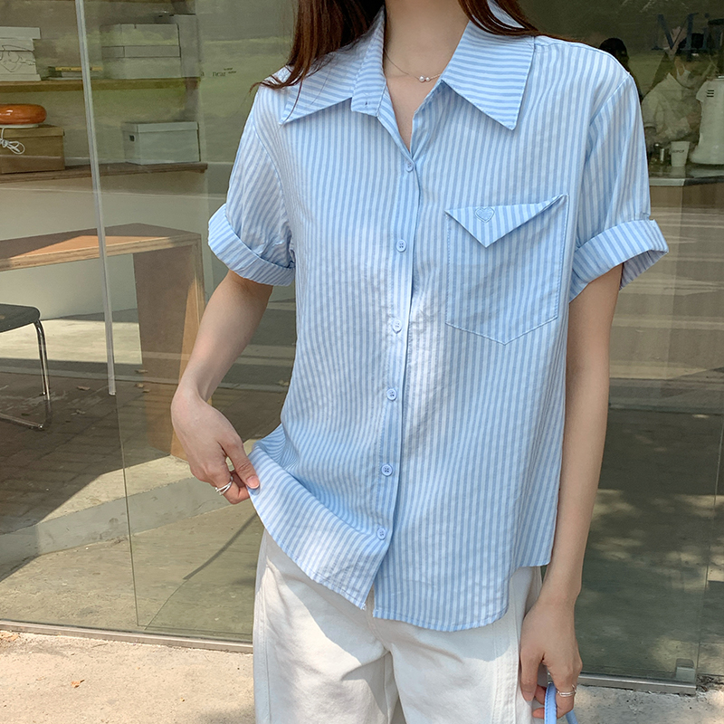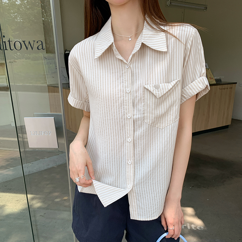 실제 가격#여자 여름을위한 줄무늬 단점 셔츠 2025 새로운 디자인 틈새 셔츠 캐주얼 느슨한 탑